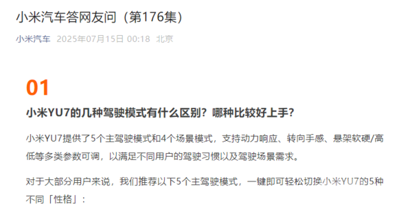 【CNMO科技消息】7月15日,小米汽车发布“小米汽车答网友问(第176集)”,回应了“小米YU7的几种驾驶模式有什么区别?”等问题。