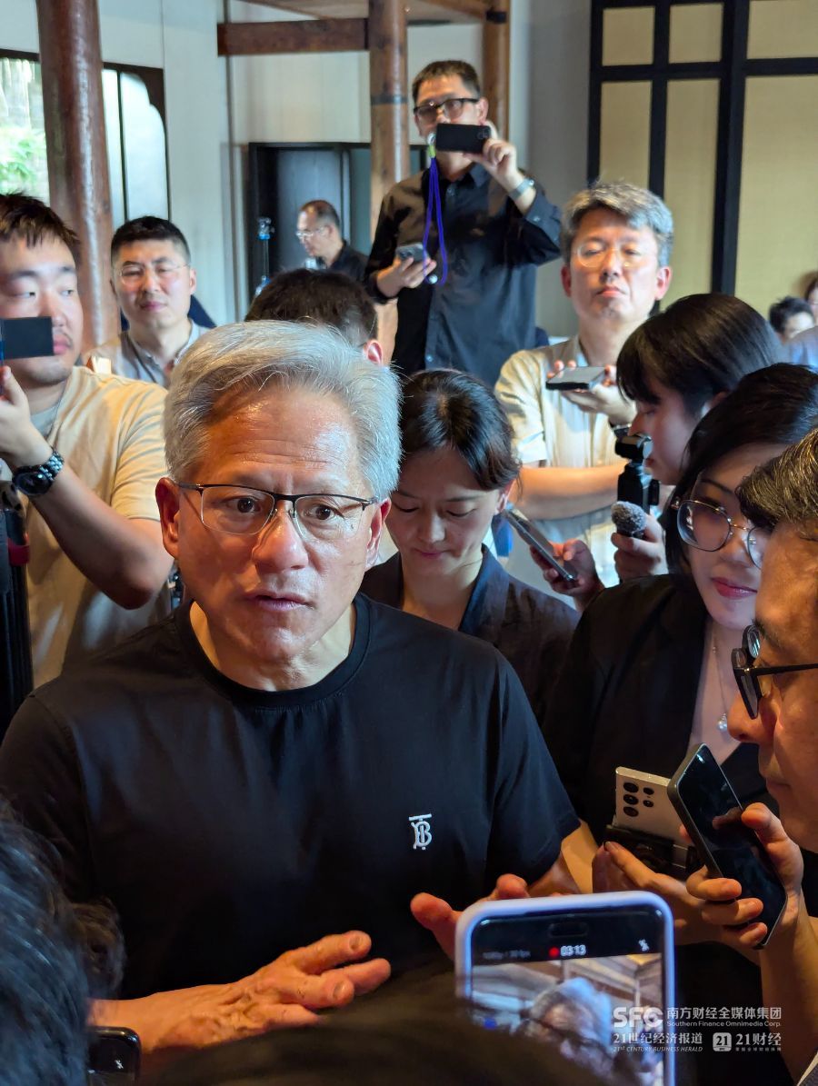 7月16日上午,英伟达创始人兼CEO黄仁勋身着唐装出席了第三届链博会并发表演讲。下午,黄仁勋换回黑色皮衣,与包括21世纪经济报道在内的媒体进行了小范围沟通,谈及了中国供应链、小米汽车,以及AI发展等多个话题。