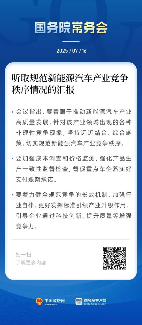 李强主持召开国务院常务会议,听取规范新能源汽车产业竞争秩序情况的汇报。会议指出,要着眼于推动新能源汽车产业高质量发展,针对该产业领域出现的各种非理性竞争现象,坚持远近结合、综合施策,切实规范新能源汽车产业竞争秩序。要加强成本调查和价格监测,强化产品生产一致性监督检查,督促重点车企落实好支付账期承诺。要着力健全规范竞争的长效机制,加强行业自律,更好发挥标准引领产业升级作用,引导企业通过科技创新、提升质量等增强竞争力。
