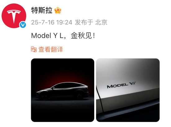 7月16日晚,特斯拉中国在其微博发文称“Model Y L,金秋见”,正式预告了加长版Model Y的到来。