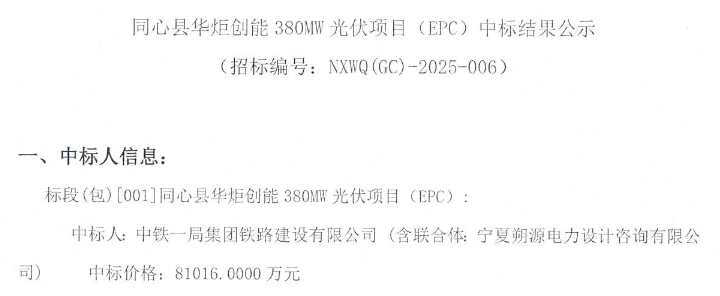 中标公告显示,同心县华炬创能380MW光伏项目(EPC)的中标企业为中铁一局集团铁路建设有限公司(含联合体:宁夏朔源电力设计咨询有限公司),中标价格为81,016万元,据数字新能源DataBM.com计算,中标单价为2.13元/W。