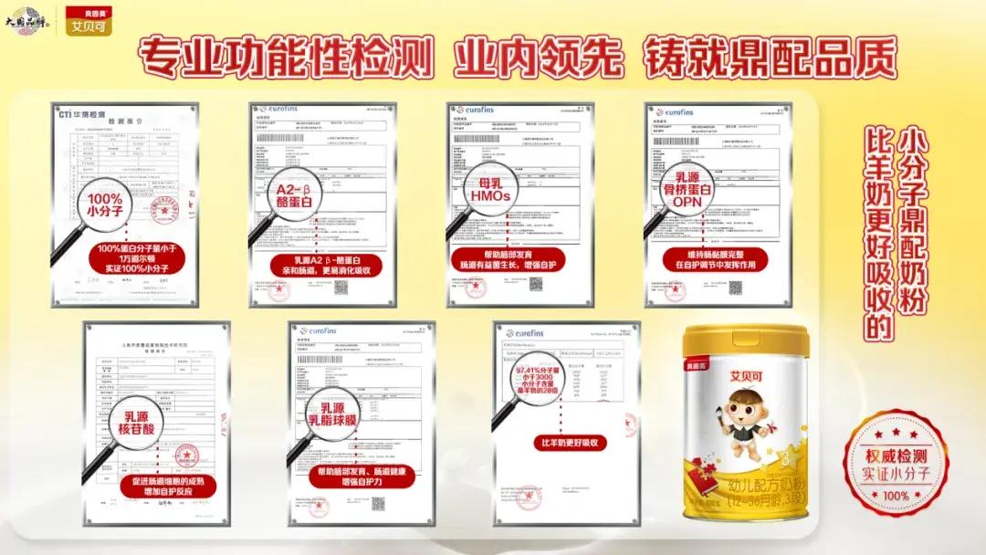纵向维度来看,艾贝可奶粉已经权威检测实证证实为100%小分子,且全部低于1万道尔顿(97.41%≤3000Da;17.107%分子≤189Da;51.361%分子在189-1000Da;28.94%分子在1000-3000Da)。