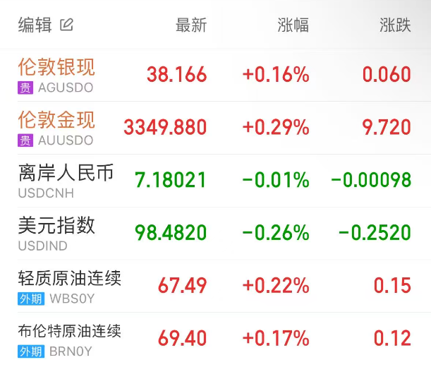 得益于美元和美债收益率走软,现货黄金上涨,伦敦金最终收涨0.29%,收报3349.88美元/盎司;现货白银连涨三日,伦敦银最终收涨0.14%,报38.166美元/盎司。