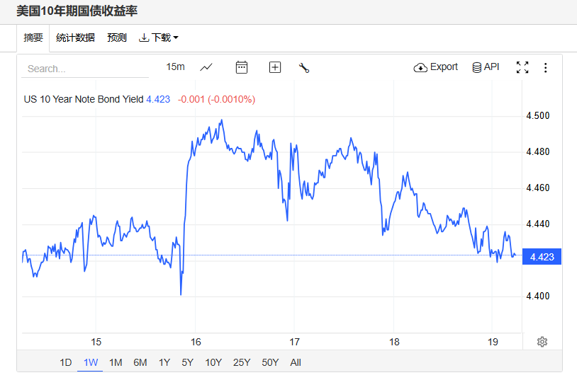 上周五,美债收益率全线走低,基准的10年期美债收益率收报4.423%,对利率更加敏感的2年期美债收益率收报3.88%。