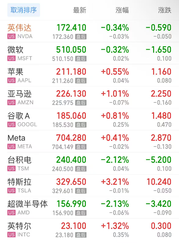 热门美股中,英伟达跌0.34%,微软跌0.32%,苹果涨0.55%,亚马逊涨1.01%,谷歌C涨0.67%,谷歌A涨0.81%,Meta涨0.41%,台积电跌2.12%,特斯拉涨3.21%,超微半导体跌2.13%,英特尔涨1.32%。