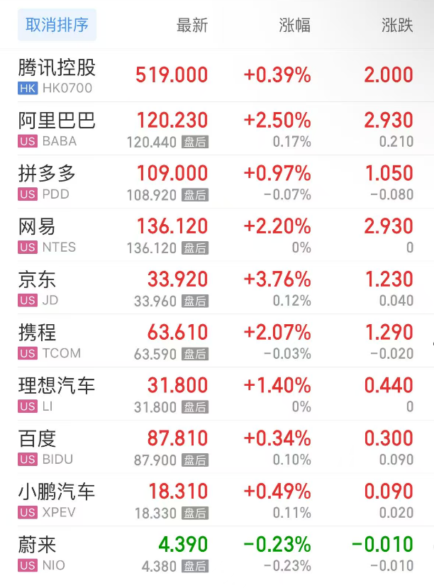 上周五热门中概股方面,腾讯控股(港股)涨0.39%,阿里巴巴涨2.50%,拼多多涨0.97%,网易涨2.20%,携程涨2.07%,理想汽车涨1.40%,百度涨0.34%,小鹏汽车涨0.49%,蔚来跌0.23%。