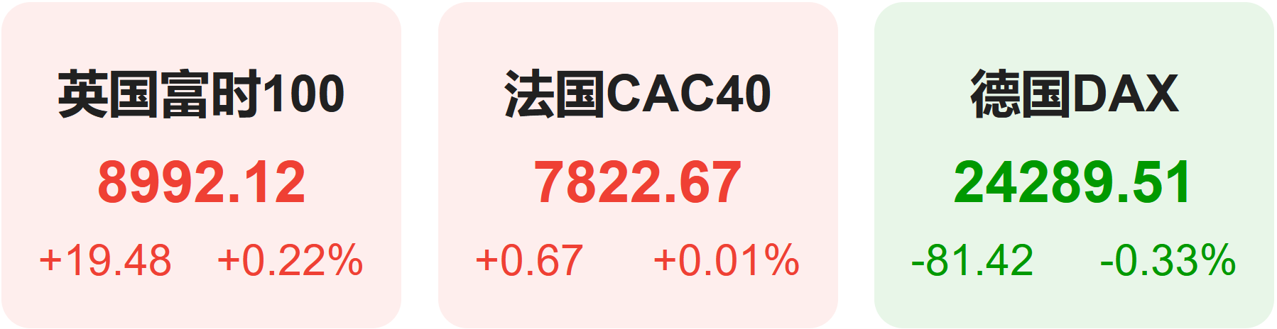 上周五,欧洲股市方面,英国富时100指数小幅上涨0.22%,报8992点。法国cac40指数小幅上涨0.01%,报7823点。德国dax指数小幅下跌0.33%,报24290点。