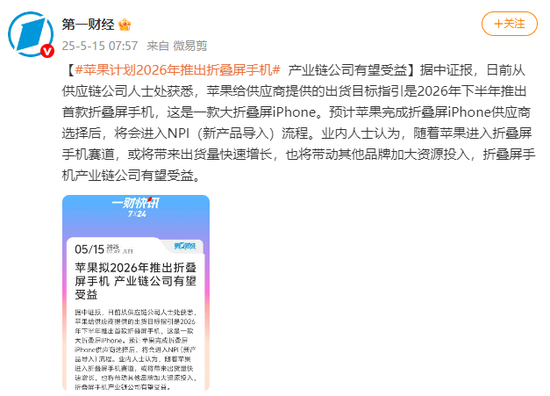 另据第一财经消息,据中证报,日前从供应链公司人士处获悉,苹果给供应商提供的出货目标指引是2026年下半年推出首款折叠屏手机,这是一款大折叠屏iPhone。预计苹果完成折叠屏iPhone供应商选择后,将会进入NPI(新产品导入)流程。