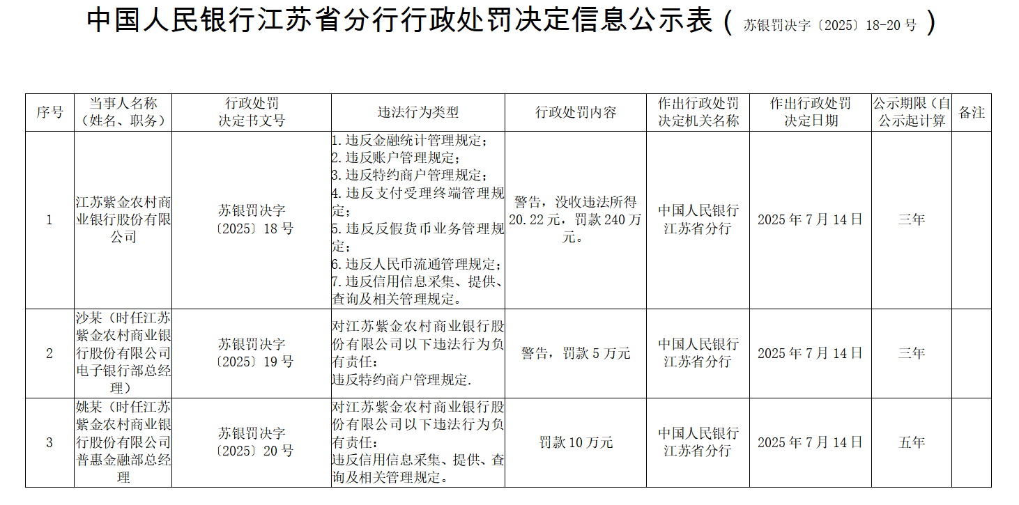 上证报中国证券网讯(记者 黄坤)近日,中国人民银行江苏省分行披露的行政处罚决定信息公示表显示,江苏紫金农村商业银行(以下简称“紫金银行”)因存在多项违法行为被警告,并没收违法所得20.22元,罚款240万元。