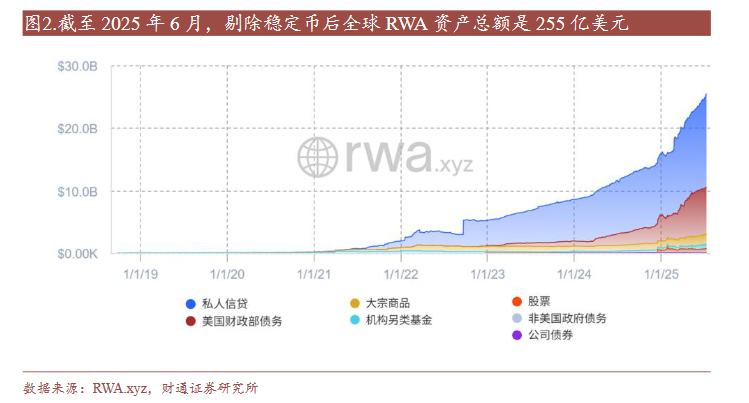 根据财通证券援引RWA.xyz的数据,截至2025年6月,剔除稳定币后的全球RWA资产总额已达到255亿美元。