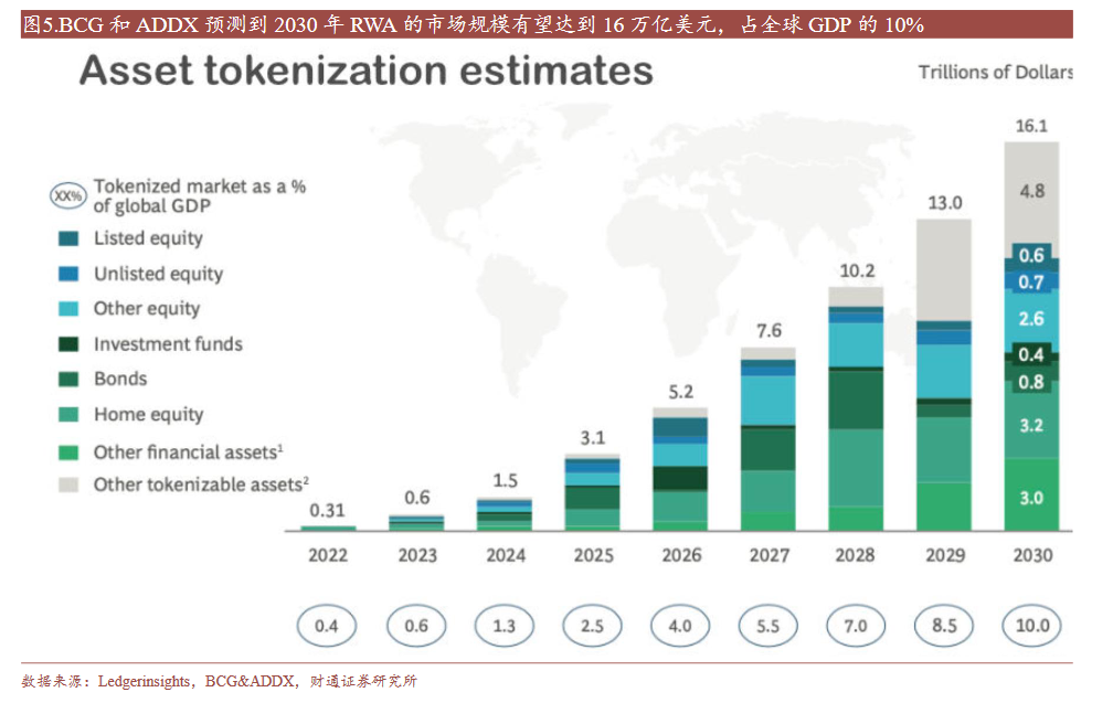 报告援引波士顿咨询公司(BCG)与ADDX联合预测,到2030年,全球资产代币化市场规模将达到16.1万亿美元,占全球GDP的10%。