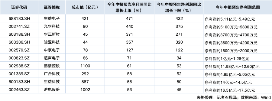其中,生益电子上半年净利同比预增432%~471%,创历史新高;光华科技上半年净利同比预增375.05%~440.26%;另有华正新材、中京电子等公司上半年净利润增幅都超100%。此外,鹏鼎控股和沪电股份这两家市值过千亿的龙头企业上半年净利同比预增均超50%,骏亚科技则实现扭亏为盈。