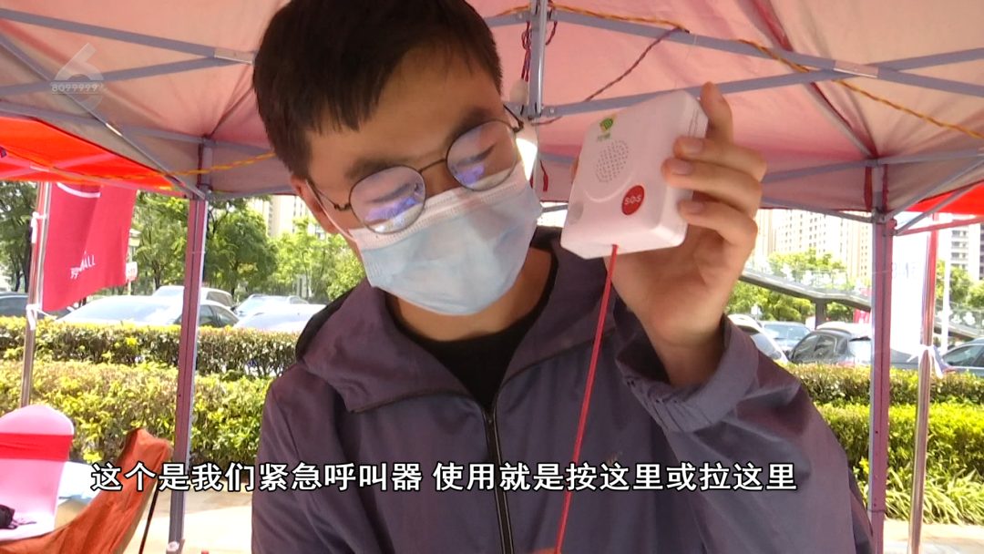 工作人员:“这个是我们紧急呼叫器,使用就是按这里或拉这里,带呼叫功能,报警之后我们这边工作人员就能收到,家属绑定之后也能收到。”