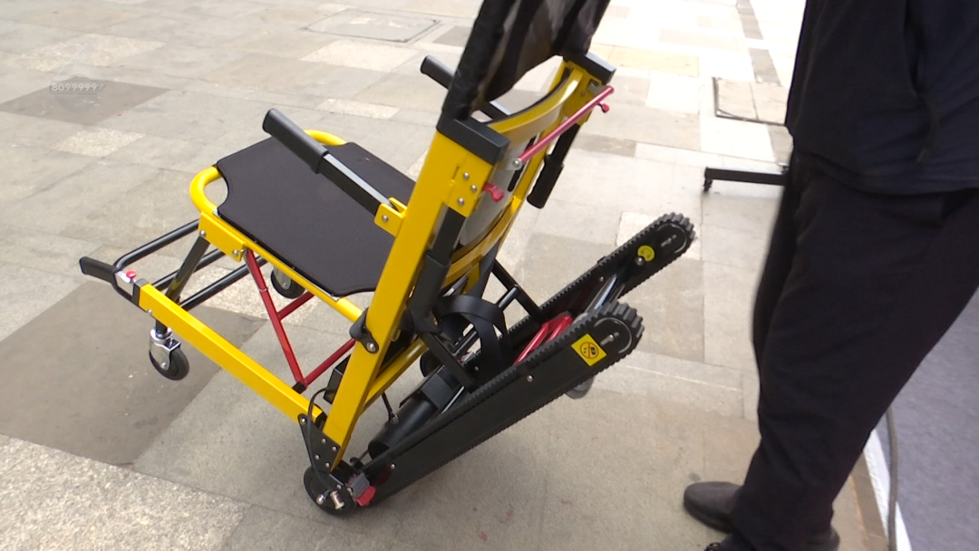 销售人员:“它是针对无电梯楼房上下楼转移病人、老人、孕妇(研发的),它只需要一个人就可以进行操作,轻便可折叠,单次充电的话它还可以支持80层的上下楼转移,我们这个设备现在在老旧居民小区使用得会比较多一些。”