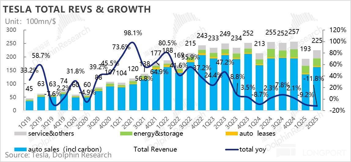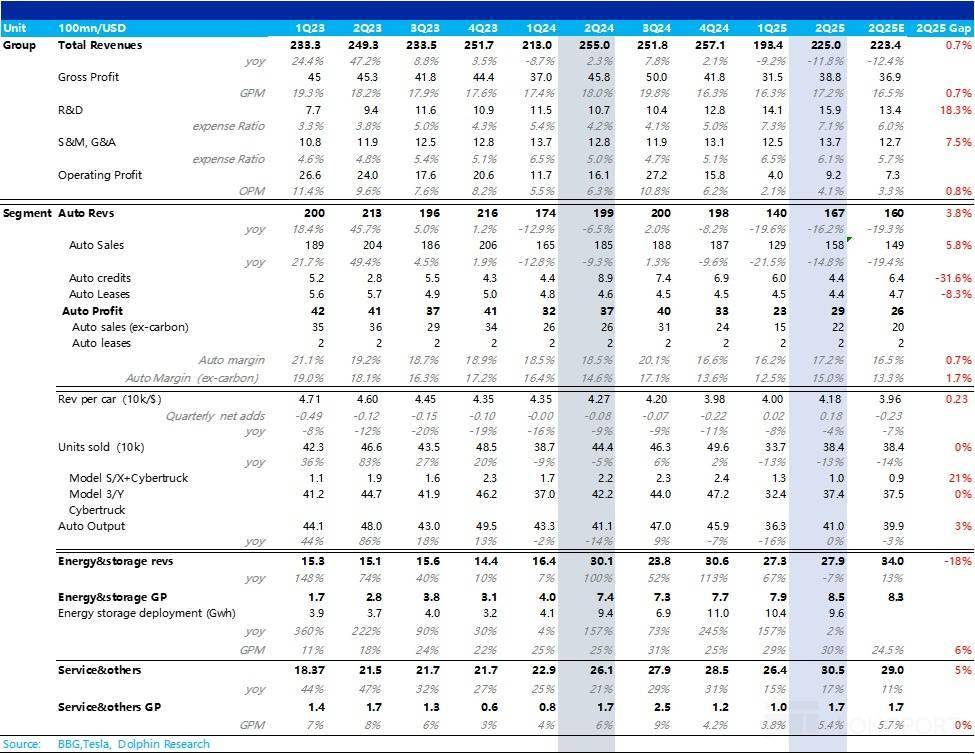 1. 总收入端表现不错:本季度总收入端225亿,超出市场预期2-3亿左右,储能业务因为关税影响收入端表现平平其实已经被price in, 而服务业务本季度还在环比上行,表现也不错,但真正超预期的仍然在最核心的汽车业务上,汽车业务基本盘终于开始有所回暖!