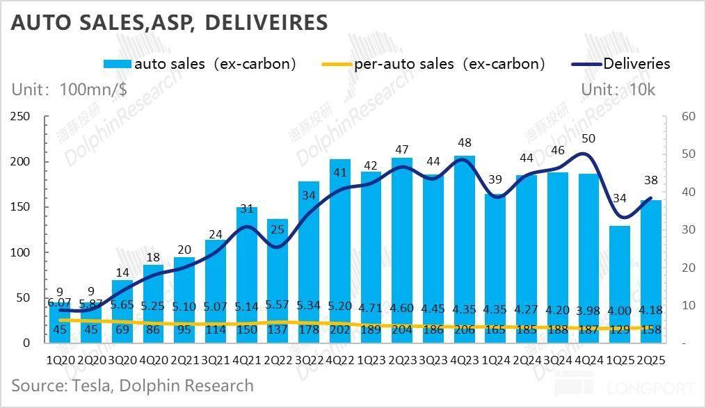 本季度总收入端225亿,实际表现不错,超出海豚君看到的223亿左右的大行预期,虽然储能业务表现一般,但由于关税影响实则已经很大程度上被市场price in(BBG预期比较老旧),而真正表现比较亮眼的是卖车收入上,终于在持续几个季度miss市场预期后,由于Model Y Juniper的换新版上市涨价,有了一次超预期的表现。