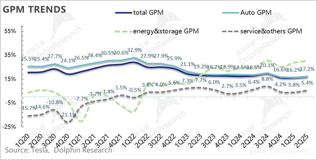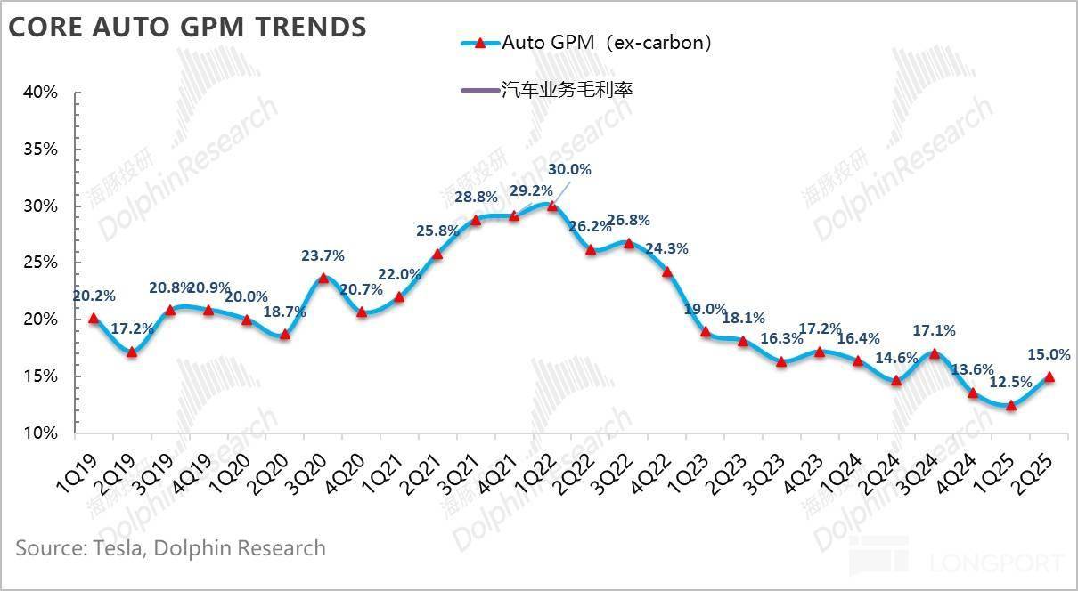 3. 卖车毛利率同样因为Juniper的上市涨价,及规模效应的改善,终于也开始环比回升了:二季度汽车销售毛利率(剔碳积分和租赁)15%,环比改善了2.5个百分点,仍然主要由于二季度的Model Y Juniper上市的定价更高,从而带来更高的卖车单价所拉动。而同时本季度摊折成本因为规模效应的下滑,对冲了关税效应的不利影响。