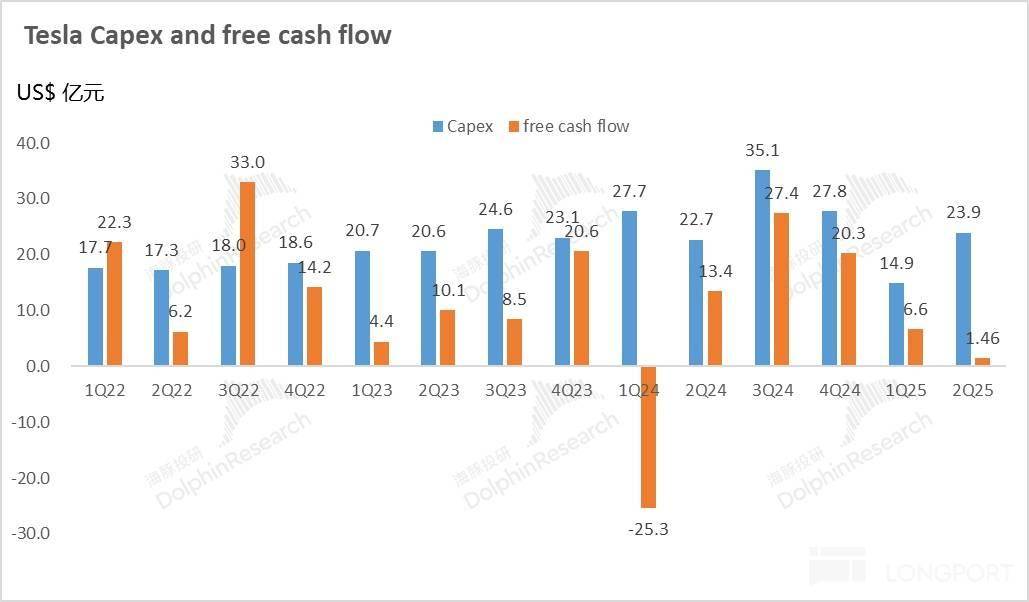 而自由现金流本季度运营现金流由于基本面的转好有所上行,资本开支上24亿,继续环比上行了9亿!仍然还在为AI业务狂投,特斯拉又在德州新增了1.6万块H200 GPU, 所以最后自由现金流仍然相比上季度卖车最烂期还要环比下滑了5亿至本季度仅1.5亿。
