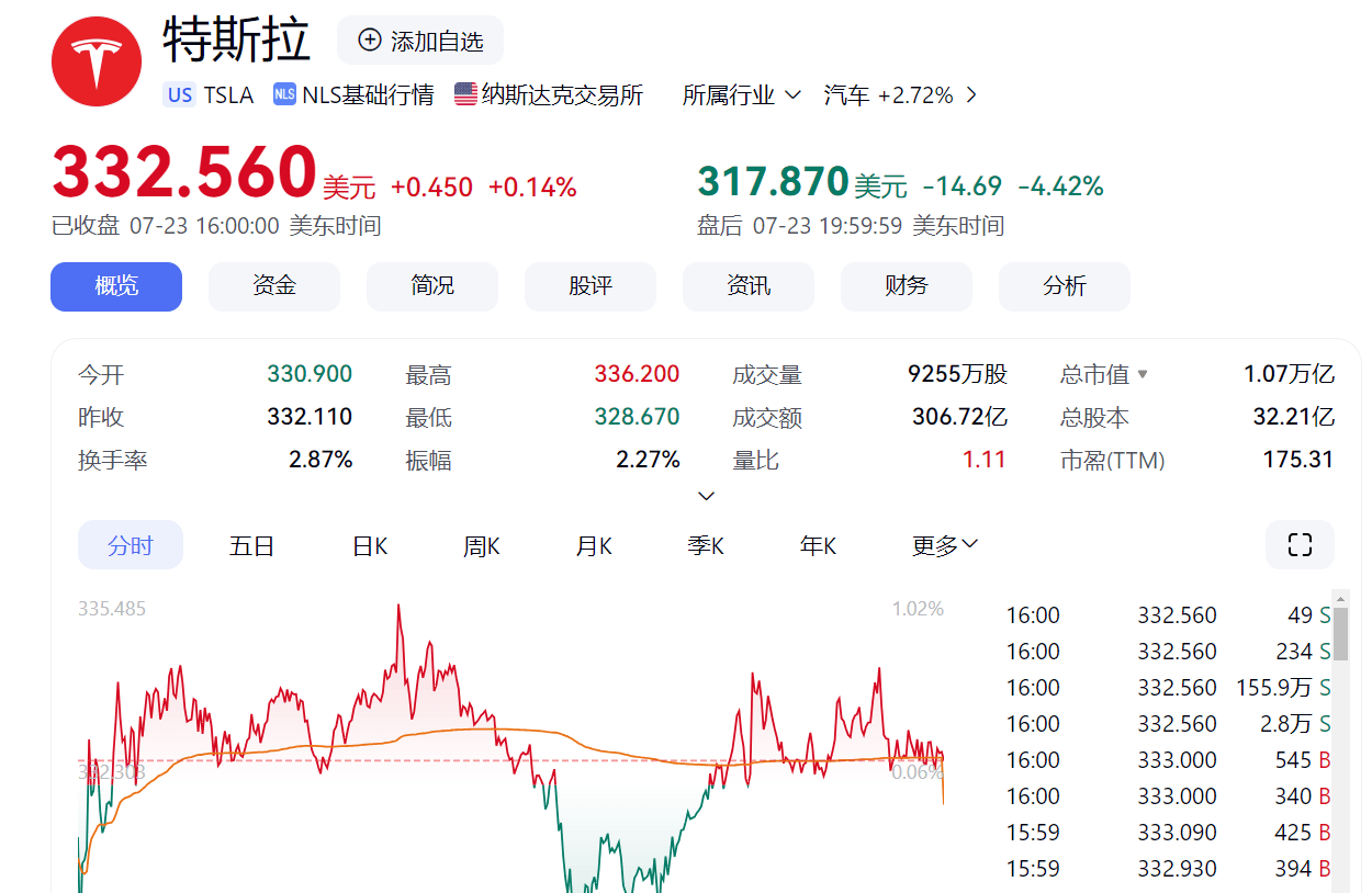 截至发稿,特斯拉美股盘后大跌4.42%。