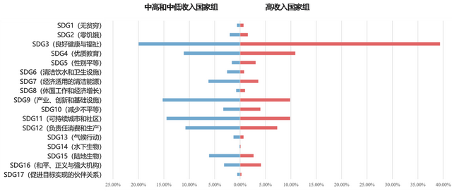 图10 高收入国家组与中高和中低收入国家组在不同可持续发展目标上的AI研究关注度分配对比 数据来源:基于对DBLP文献数据库的统计分析(2024年4月至2025年3月期间;横轴代表两个国家组在各个可持续发展目标上的AI出版物在所有与可持续发展目标相关的AI出版物中的占比)