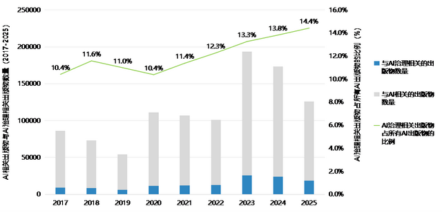 图9 AI治理相关出版物数量及其在所有AI相关出版物总量中的占比(2017–2025年) 数据来源:基于对DBLP数据库的统计分析(截至2025年3月)