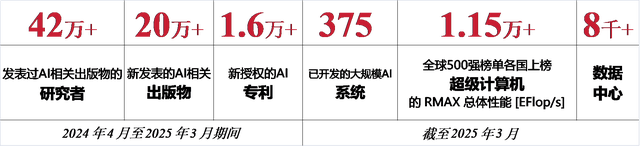 图6 40国、高收入国家组、中高和中低收入国家组在各评估维度上的平均分 根据统计,此次评估的40个国家在过去一年内共有超过42万名研究人员发表了超过20万篇与AI相关的出版物,并且有超过1.6万项专利获得授权。截至2025年3月,这些国家已经开发了375个大型AI系统,拥有累计超过11,500 EFlop/s的超级计算机算力,并拥有至少8,000余个托管数据中心来支持AI相关的研发活动。