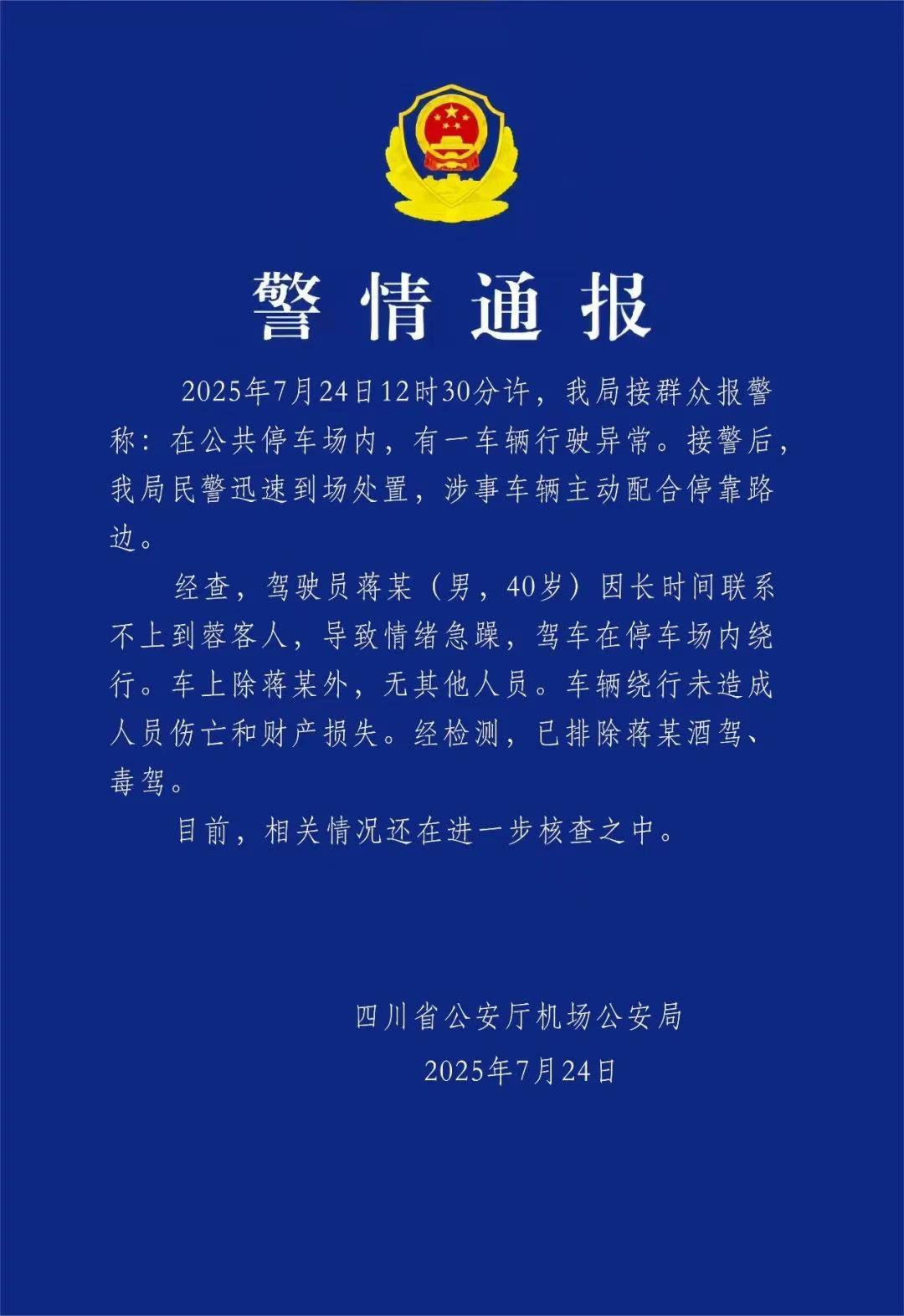 经查,驾驶员蒋某(男,40岁)因长时间联系不上到蓉客人,导致情绪急躁,驾车在停车场内绕行。车上除蒋某外,无其他人员。车辆绕行未造成人员伤亡和财产损失。经检测,已排除蒋某酒驾、毒驾。目前,相关情况还在进一步核查之中。(中新经纬APP)