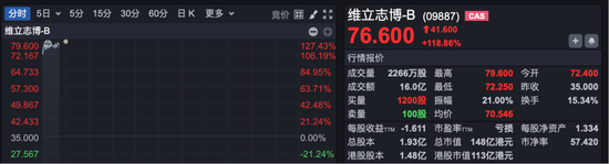 港股创新药维立志博-B上市首日开盘一度涨超120%,现报76.6港元/股。