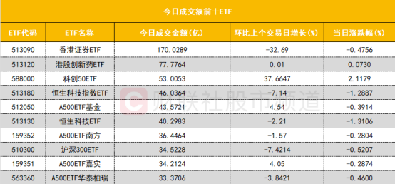 从成交额前十的ETF来看,香港证券ETF(513090)成交额位居首位,港股创新药ETF(513120)成交额位居次席。