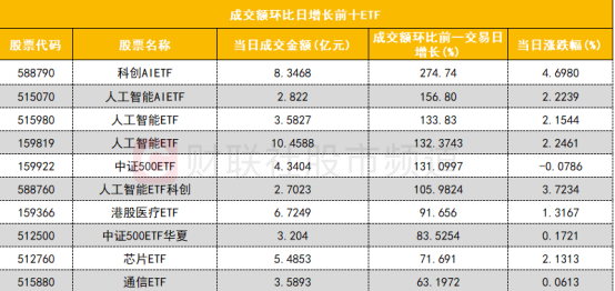 从成交额环比增长前十的ETF来看,多只人工智能相关ETF成交额大增,其中科创AIETF(588790)成交额环比增长274%位居首位。