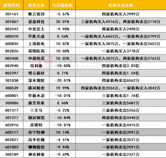 卖出方面,尾盘跌停的创新药概念股昂利康遭机构卖出超3亿;华新水泥遭机构卖出1.76亿,该股连续两日遭机构大幅卖出;深水规院遭机构卖出超6000万。