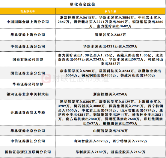量化资金活跃度较高,西藏天路遭一家量化席位卖出1.05亿;创新药概念股塞力医疗遭一家量化席位大幅做T。