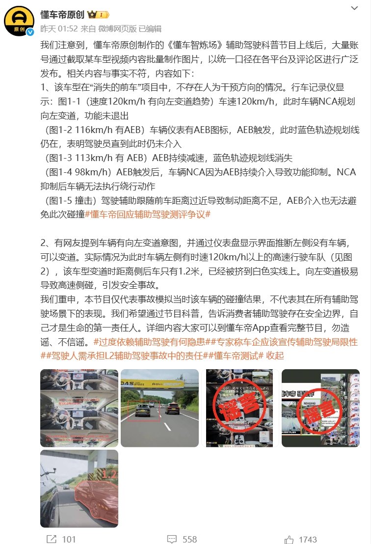 此外,针对实测多辆车辅助驾驶而引发的一些质疑,7月24日,懂车帝发文回应称,懂车帝原创制作的《懂车智炼场》辅助驾驶节目上线后,大量账号通过截取某车型视频内容批量制作图片,以统一口径在各平台及评论区进行广泛发布,相关内容与事实不符。