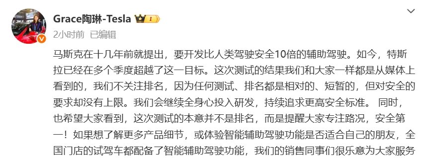 特斯拉副总裁陶琳当日下午发文回应称:马斯克在十几年(前)就提出,要开发比人类驾驶安全10倍的辅助驾驶。如今,特斯拉已经在多个季度超越了这一目标。这次测试的结果我们和大家一样都是从媒体上看到的,我们不关注排名,因为任何测试、排名都是相对的、短暂的,但对安全的要求却没有上限。我们会继续全身心投入研发,持续追求更高安全标准。 同时,也希望大家看到,这次测试的本意并不是排名,而是提醒大家专注路况,安全第一!
