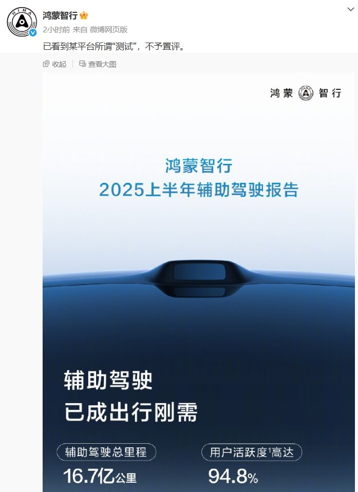 25日下午,AITO汽车、智界汽车、鸿蒙智行在微博发文称:已看到某平台所谓“测试”,不予置评。