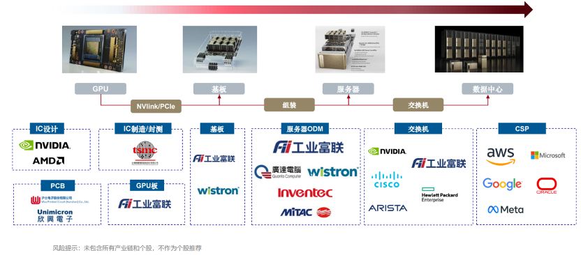 这是对算力产业链的简单示意图,流程上,英伟达先设计GPU,接着委托台积电做制造和封装测试,然后交给下游的ODM厂商做成一个基板,在这个基础上进一步把它组装成服务器,再把服务器转交给下游的云厂商,这些云厂商可能在进行组网的时候也需要购买交换机。