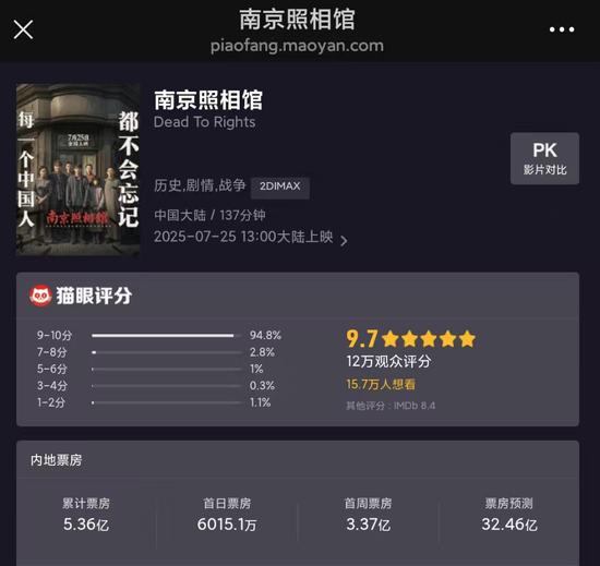 7月29日,据猫眼专业版最新数据显示,《南京照相馆》上映5天,累计票房已达5.36亿。该片预测票房为32.46亿。