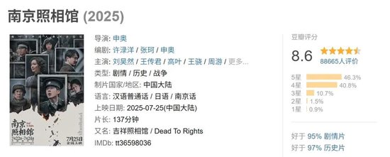 《南京照相馆》豆瓣开分8.5分,随后评分上涨至8.6,已有超8.8万人评价。