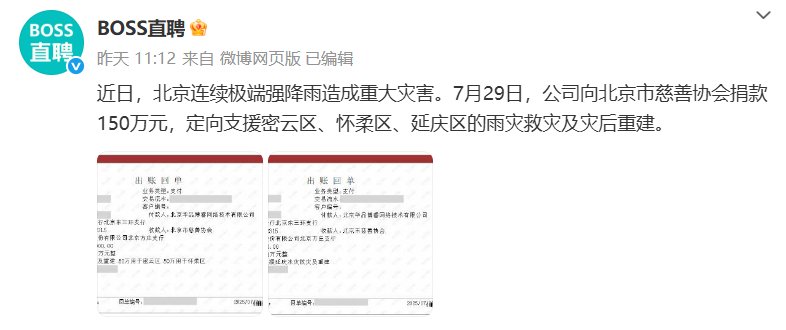 BOSS直聘宣布,向北京市慈善协会捐款150万元,定向支援密云区、怀柔区、延庆区的水灾救灾及灾后重建。