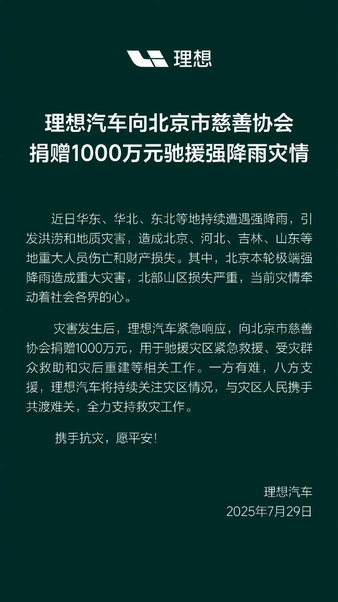 理想汽车宣布,向北京市慈善协会捐赠1000万元,用于驰援强降雨灾区,紧急救援、受灾群众救助和灾后重建等相关工作。