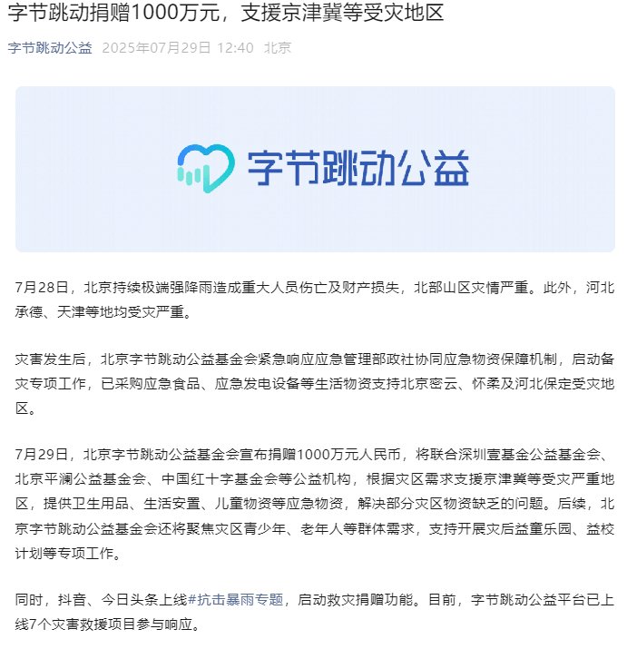 北京字节跳动公益基金会宣布,捐赠1000万元人民币,将联合深圳壹基金公益基金会、北京平澜公益基金会、中国红十字基金会等公益机构,根据灾区需求支援京津冀等受灾严重地区,提供卫生用品、生活安置、儿童物资等应急物资,解决部分灾区物资缺乏的问题。后续,北京字节跳动公益基金会还将聚焦灾区青少年、老年人等群体需求,支持开展灾后益童乐园、益校计划等专项工作。