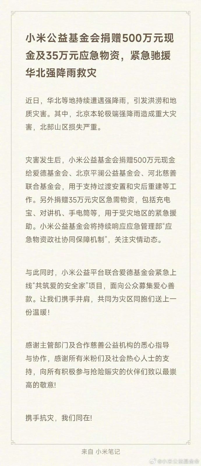 小米公益基金会宣布,捐赠500万元现金及35万元应急物资,紧急驰援华北强降雨救灾。