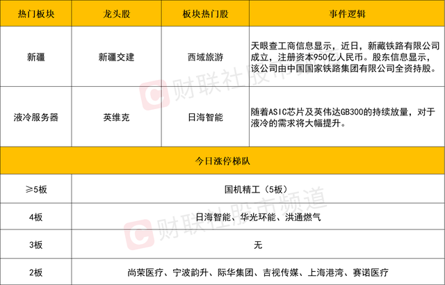 新疆、轨交设备概念股也于午后,西域旅游、八一钢铁、天山股份、国统股份、天顺股份(维权)、西部建设等个股涨停。消息面上,天眼查工商信息显示,近日,新藏铁路有限公司成立,注册资本950亿人民币。股东信息显示,该公司由中国国家铁路集团有限公司全资持股。