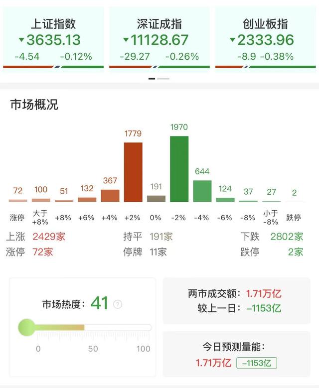 财联社8月8日讯,市场全天窄幅震荡,三大指数小幅下跌。沪深两市全天成交额1.71万亿,较上个交易日缩量1153亿。盘面上,市场热点较为杂乱,个股跌多涨少,全市场超2800只个股下跌。从板块来看,新疆本地股午后爆发,八一钢铁等10余股涨停。超级水电概念股展开反弹,山河智能涨停。高铁概念股震荡走强,金鹰重工20CM涨停。下跌方面,AI应用股集体大跌,鼎捷数智等多股跌超10%。截至收盘,沪指跌0.12%,深成指跌0.26%,创业板指跌0.38%。
