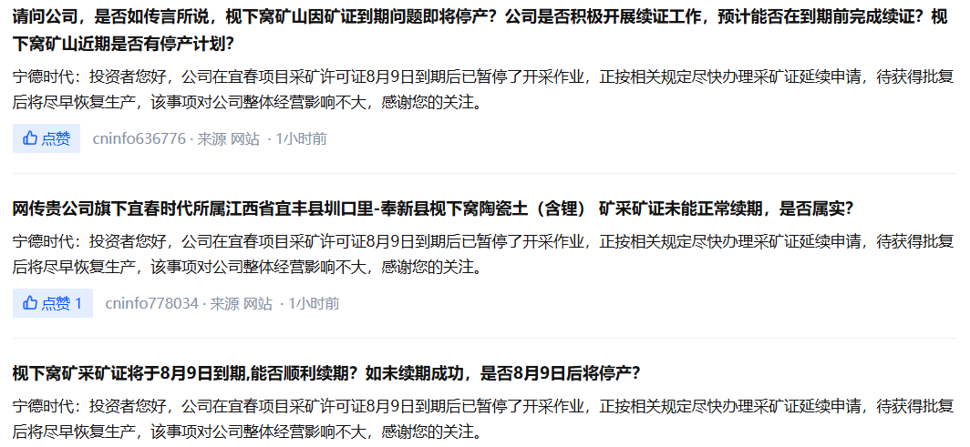 消息面,宁德时代枧下窝矿区采矿端于8月9日停产。自8月10日起,该矿山采矿端就不开展工作,且短期内没有复产计划。8月11日,宁德时代在互动平台回复投资者提问表示,公司在宜春项目采矿许可证8月9日到期后已暂停了开采作业,正按相关规定尽快办理采矿证延续申请,待获得批复后将尽早恢复生产,该事项对公司整体经营影响不大。