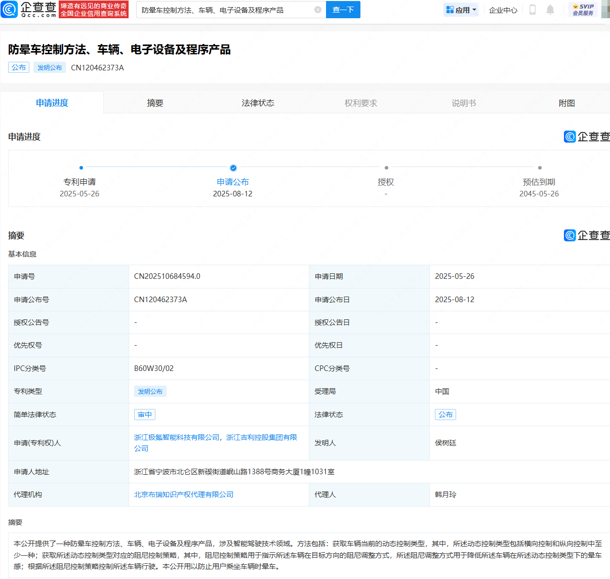 企查查APP显示,8月12日,浙江极氪智能科技有限公司、浙江吉利控股集团有限公司申请的“防晕车控制方法、车辆、电子设备及程序产品”专利公布。