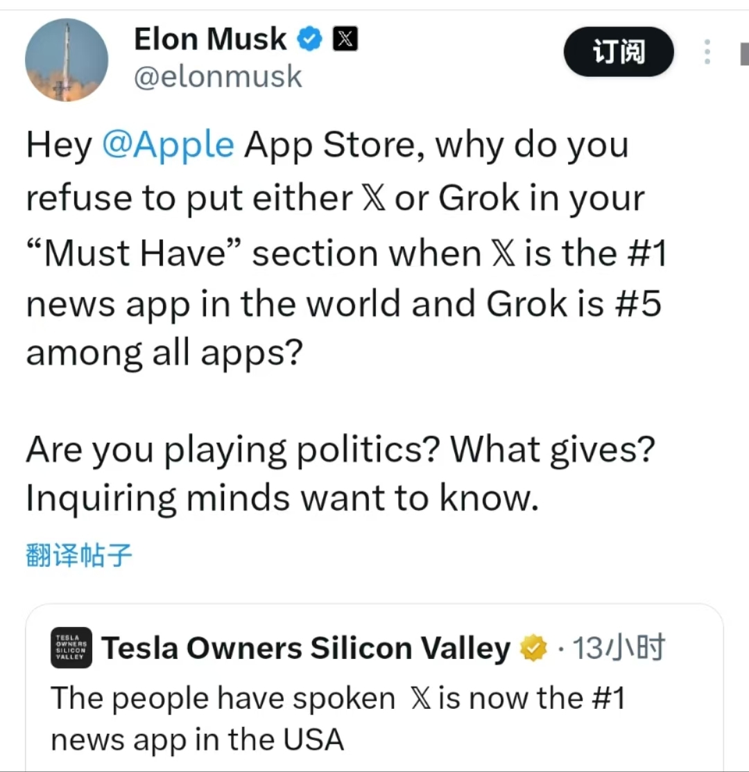 他还在另一条帖子中写道。:“当X是全球排名第一的新闻应用,而Grok在所有应用中排名第五时,为什么你拒绝将X或Grok放在你的“必备应用”部分?你是在玩弄政治吗?”