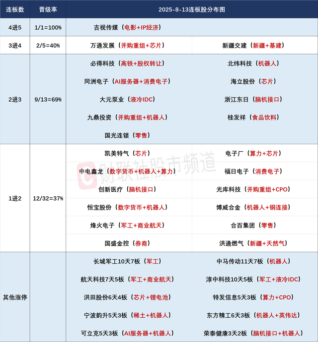 连板晋级率升至63.16%,最高标吉视传媒缩量T字板实现4进5,进而带动3板及以上连板股家数升至两位数,10厘米方向连板股接力情绪显著回升。不过近期表现强势的新疆本地股中仅有新疆交建实现连板晋级,实现晋级的品种仍多为近期热门的趋势方向。且军工、机器人、算力等热门主线中,长城军工、中马传动、淳中科技等10厘米趋势抱团核心品种今日均以涨停报收并创出历史新高。相反上周火热的20厘米个股,总体仍表现出一定分歧,或与东芯股份、上纬新材等人气龙仍处于重点监控中密切相关。