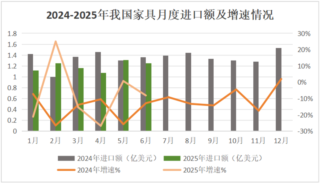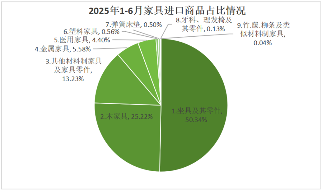 2025年1-6月,我国家具进口商品中,坐具及其零件累计进口额3.58亿美元,同比下降6.95%,占全部进口额的50.34%;