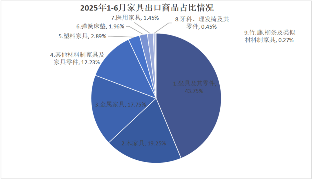 2025年1-6月,我国家具出口商品中,坐具及其零件累计出口额152.73亿美元,同比下降8.95%,占全部家具出口商品的43.75;